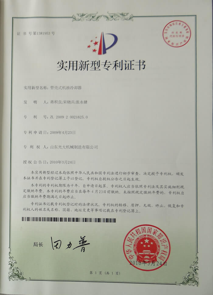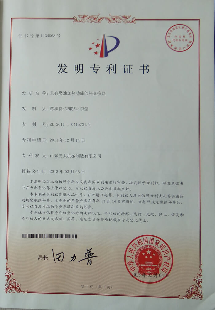 Heat exchanger with fuel oil heating function - invention patent certificate